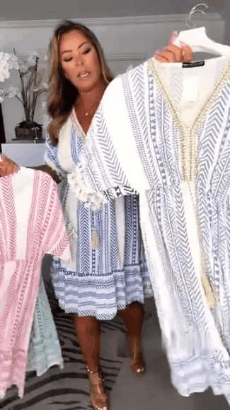 Add a boho touch to your wardrobe with this flowy, lightweight dress — perfect for summer. Its ethnic print, lace-trimmed V-neckline, and short sleeves with pompom details make it a unique and elegant piece. Ideal for a seaside getaway, a summer stroll, or a relaxed day out, this dress combines comfort and style effortlessly.